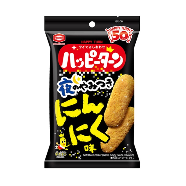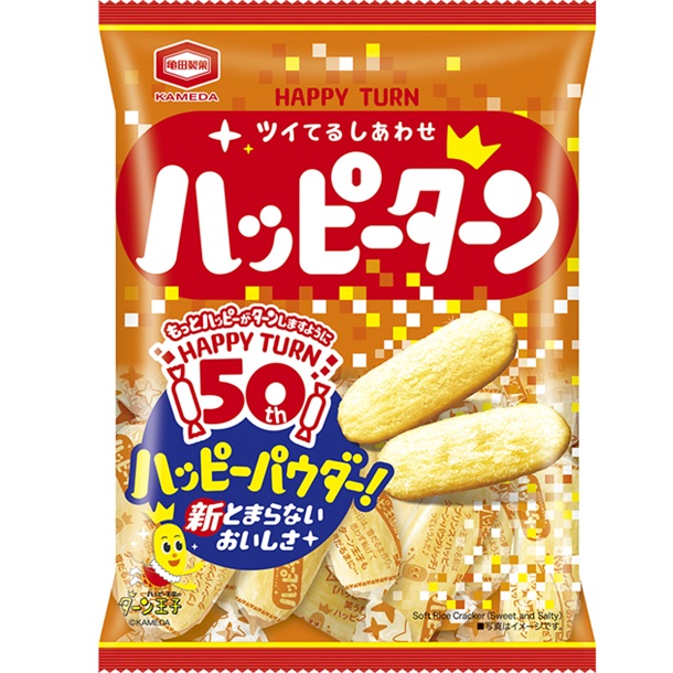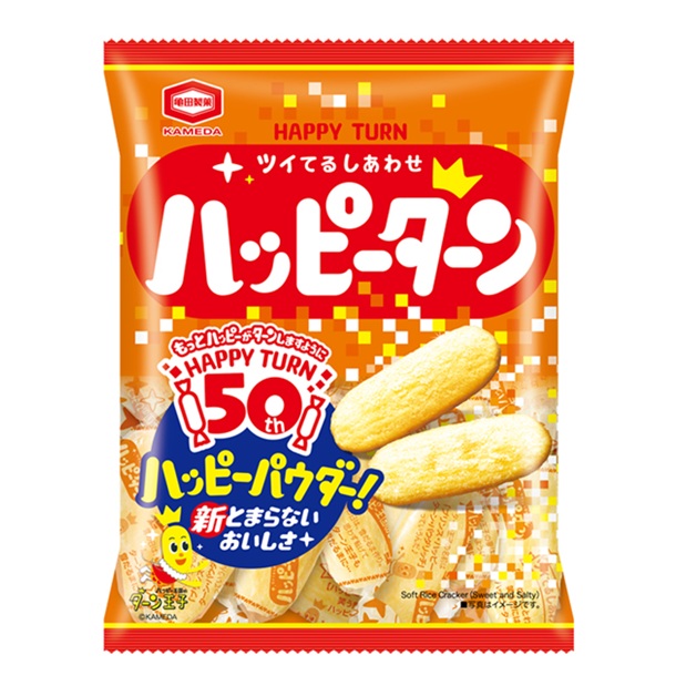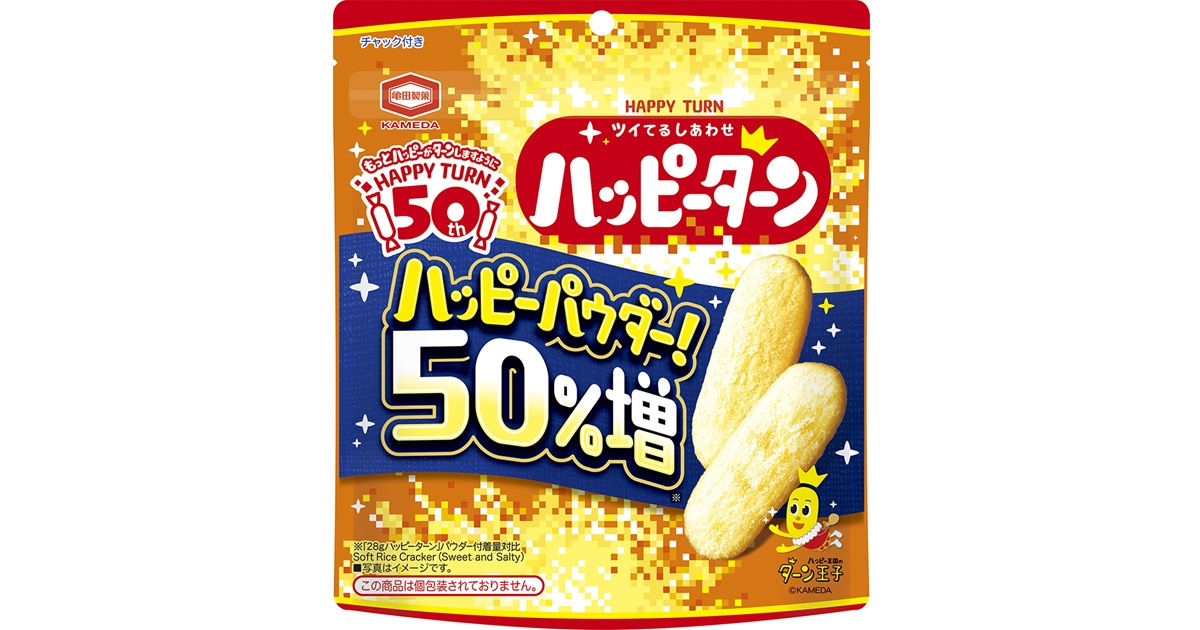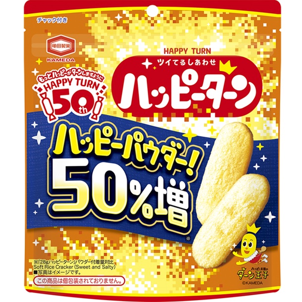 ハッピーターン発売50周年記念商品。ハッピーパウダーをいつもの50%増量した、より濃厚で満足感のある味わいです。