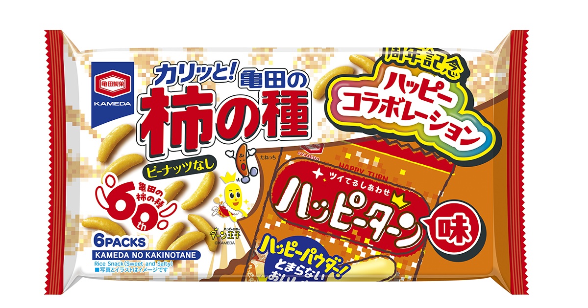 ハッピーターン50周年×亀田の柿の種60周年W周年記念商品。ハッピーターンの唯一無二である、あの“あまじょっぱい”おいしさを、亀田の柿の種ならではの独自の味付け製法で再現しました。
