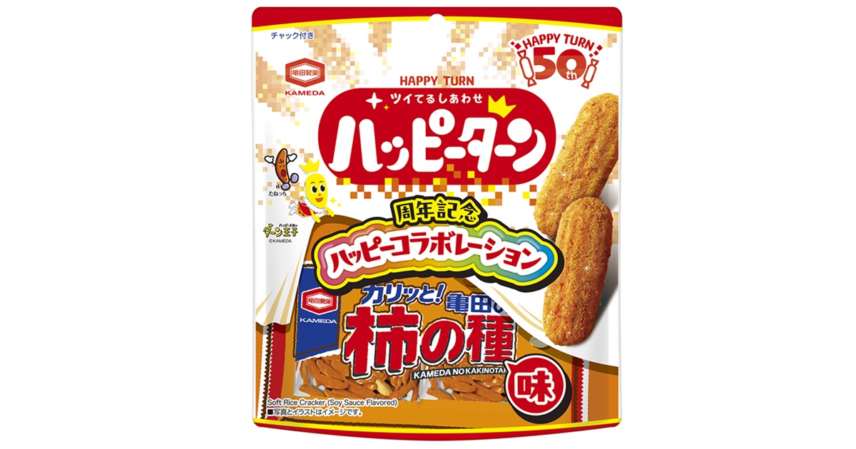 ハッピーターン50周年×亀田の柿の種60周年W周年記念商品。ハッピーパウダーの“あまじょっぱさ”を残しながら、亀田の柿の種のピリ辛な醤油の香ばしさと、ピーナッツの香りを掛け合わせた「亀田の柿の種」の味わいを表現しています。