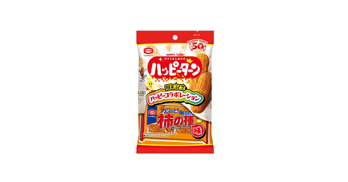 ハッピーターン50周年×亀田の柿の種60周年W周年記念商品。ハッピーパウダーの“あまじょっぱさ”を残しながら、亀田の柿の種のピリ辛な醤油の香ばしさと、ピーナッツの香りを掛け合わせた「亀田の柿の種」の味わいを表現しています。