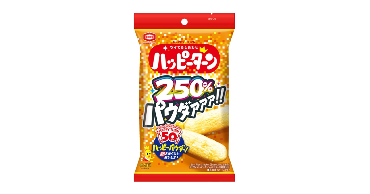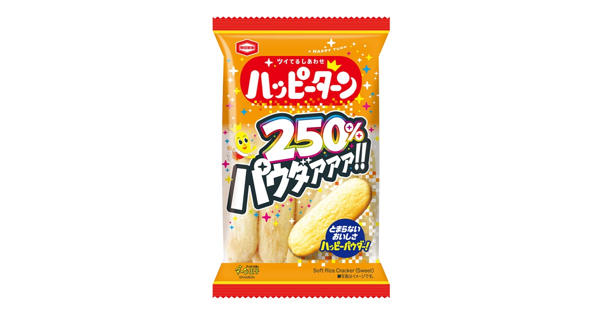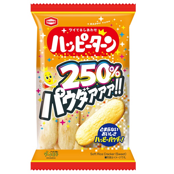 ハッピーパウダーでとまらないおいしさ!あまじょっぱい専用のハッピーパウダーをいつもの250%つけた濃厚な甘じょっぱさのハッピーターン!ラッキーアイテムとしてハートハッピーが入っているかも!?