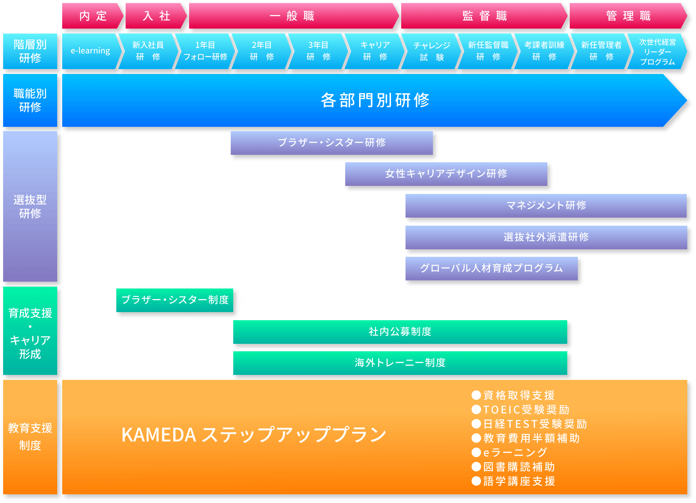 - 「社内公募制度」や「海外トレーニー制度」を活用して、新たな部門にて活躍の場を広げることができます。また、亀田製菓では、「KAMEDA ステップアッププラン」という各種自己啓発制度を整備しています。従業員自らの主体性・積極性を高めるためのバックアップも行っています。