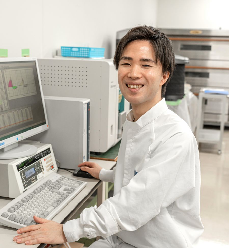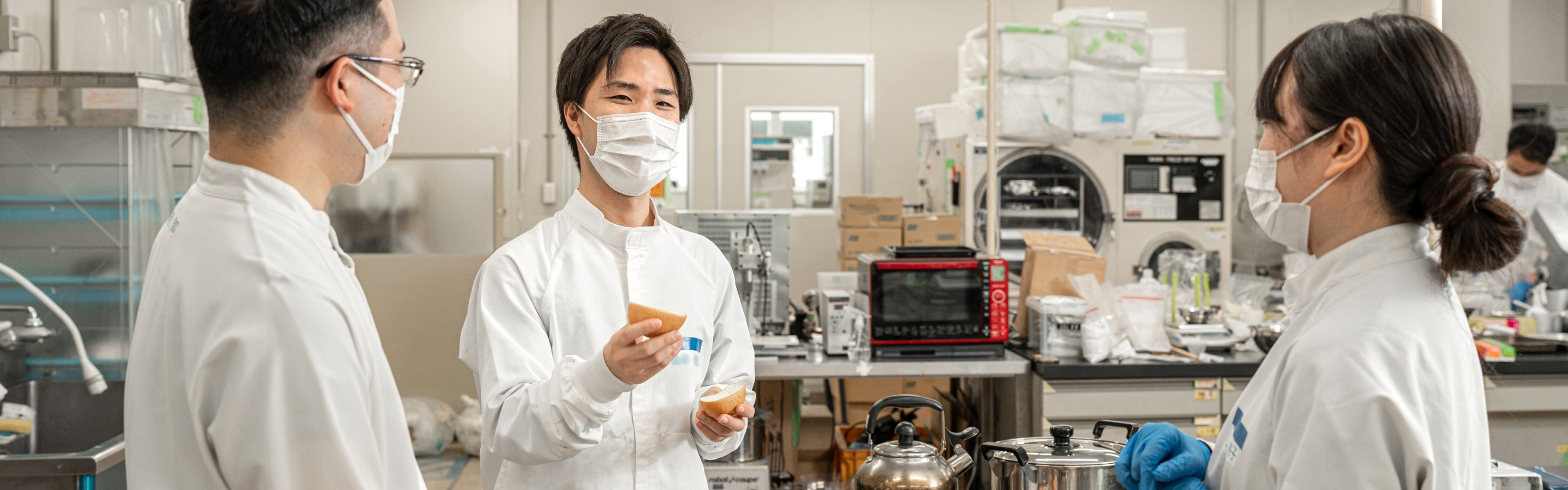 チームを発足して初めての仕事は、研究テーマを創出するために社内の要望を多角的にヒアリングすることでした。製造現場の課題を洗い出したり、お菓子のトレンドや地域の米菓をリサーチしたり。その中から、食感や味、香りの数値化を通して商品開発に貢献するという研究テーマが一つ立ち上がったのです。