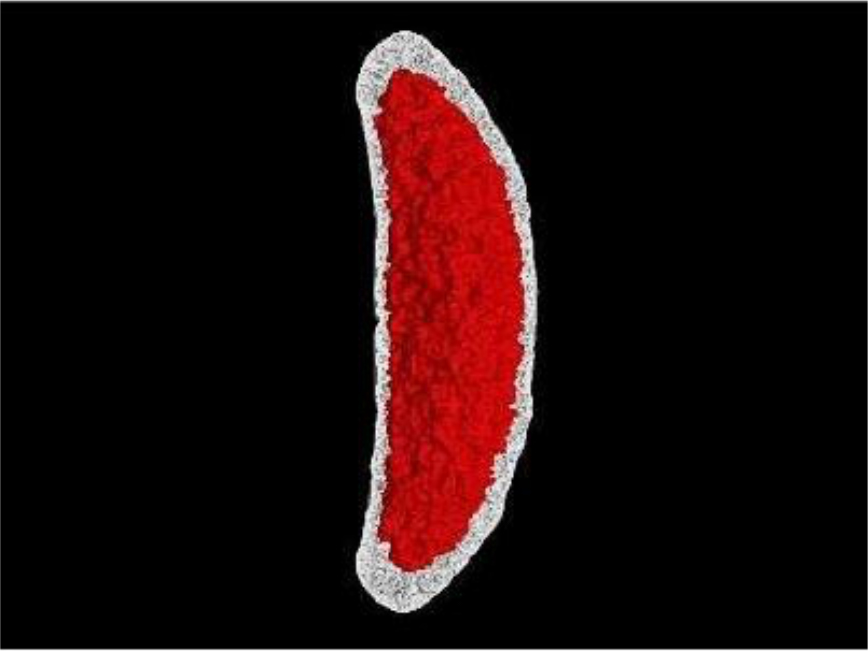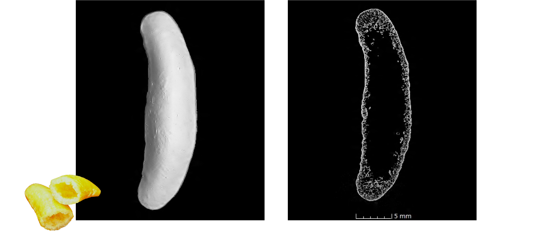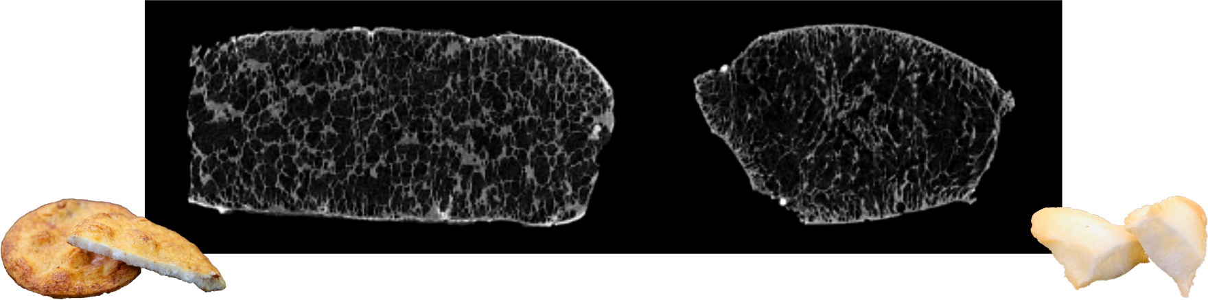 例えば、亀田の柿の種は「いつでもカリッと」した食感ですが、内部の空洞割合が大きいものがカリッと感を高めていることが分かってきました。下図は、赤い部分が柿の種の中の空洞で、白い部分が生地です。