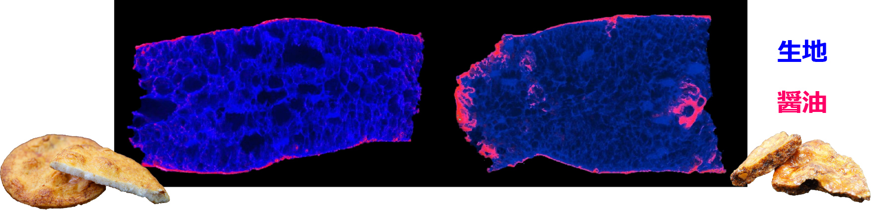 「あられ・おかき」と「せんべい」では、内部構造が大きく異なっており、『サラダホープ』(新潟県内限定販売)などのあられに見られる大きな気泡構造がソフトですうっととけるあの食感に大きく影響していることも分かってきました。