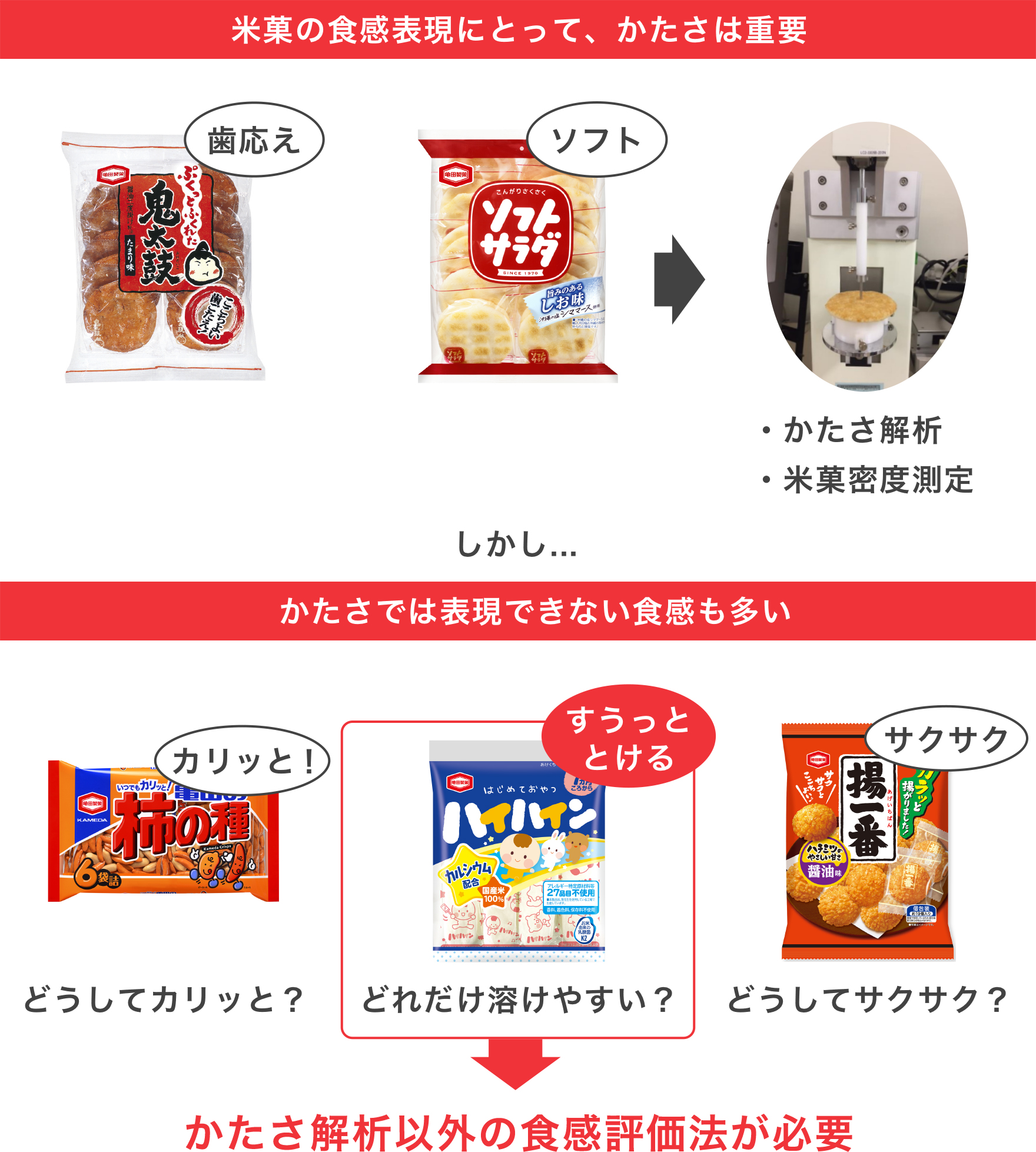 しかし、米菓の食感はかたい、やわらかいだけでしょうか?米菓は原料や製法により、様々な食感に変化する食品で、『亀田の柿の種』はいつでも「カリッと」した食感を提供しています。また『ハイハイン』という商品は口の中で「すうっととける」食感を特徴としており、生後7ヵ月ごろからの赤ちゃんにも安心して召し上がっていただけます。これら「カリッと」「すうっととける」などといった単純なかたさだけでは表すことができない米菓食感が数多くある一方、その評価方法はこれまでありませんでした。