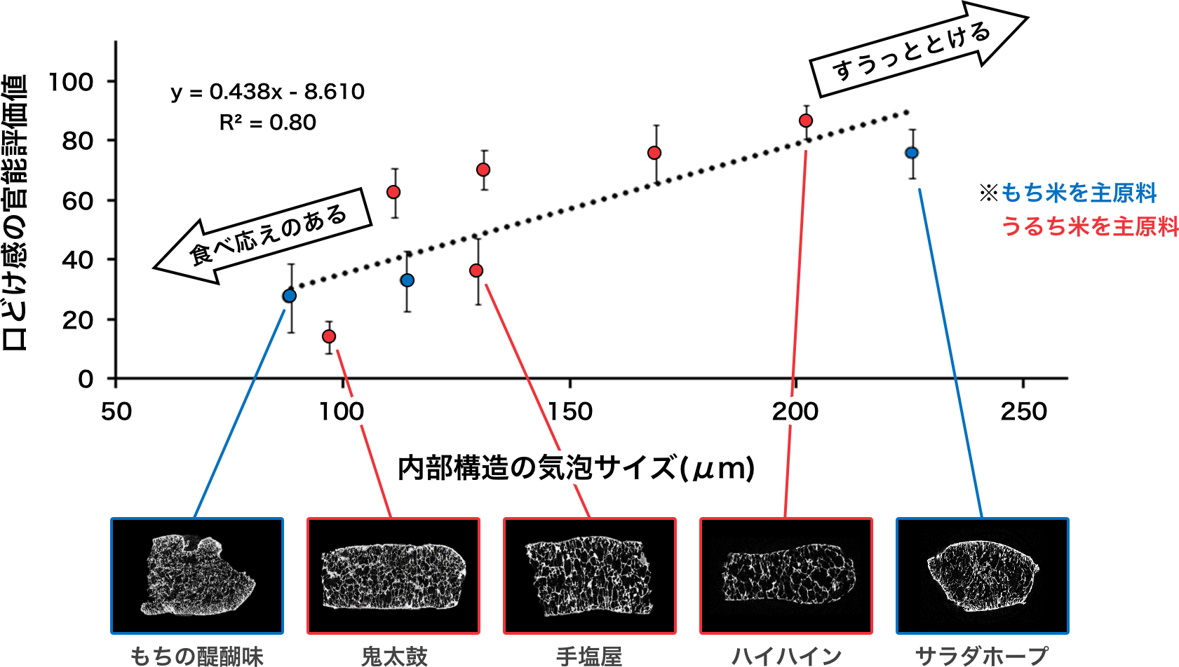 この構造が口どけ感に影響を与えていると考え、官能評価(人の感覚を使った評価)で口どけ感の異なるとされた11種類の米菓を対象に構造解析を行いました。