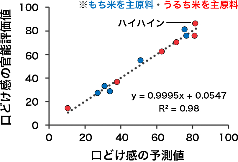 これら物理特性値と先ほどの構造値を用いて、口どけ感を実際の米菓を食べずに表すことが可能な予測評価式を作成しました。
