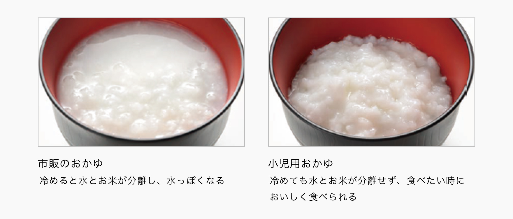 「胃腸炎回復期には早期に普通食に戻した方が良いが、すぐに食べられないお子さんは多い。消化が良く食べやすいおかゆは、小児医療の現場で必要性が高い」と先生からお聞きした内容は、おかゆが必要な場面を再認識し、可能性に気づかせてもらうものでした。そこからお子さんに食べやすいおかゆの研究開発がスタートしました。