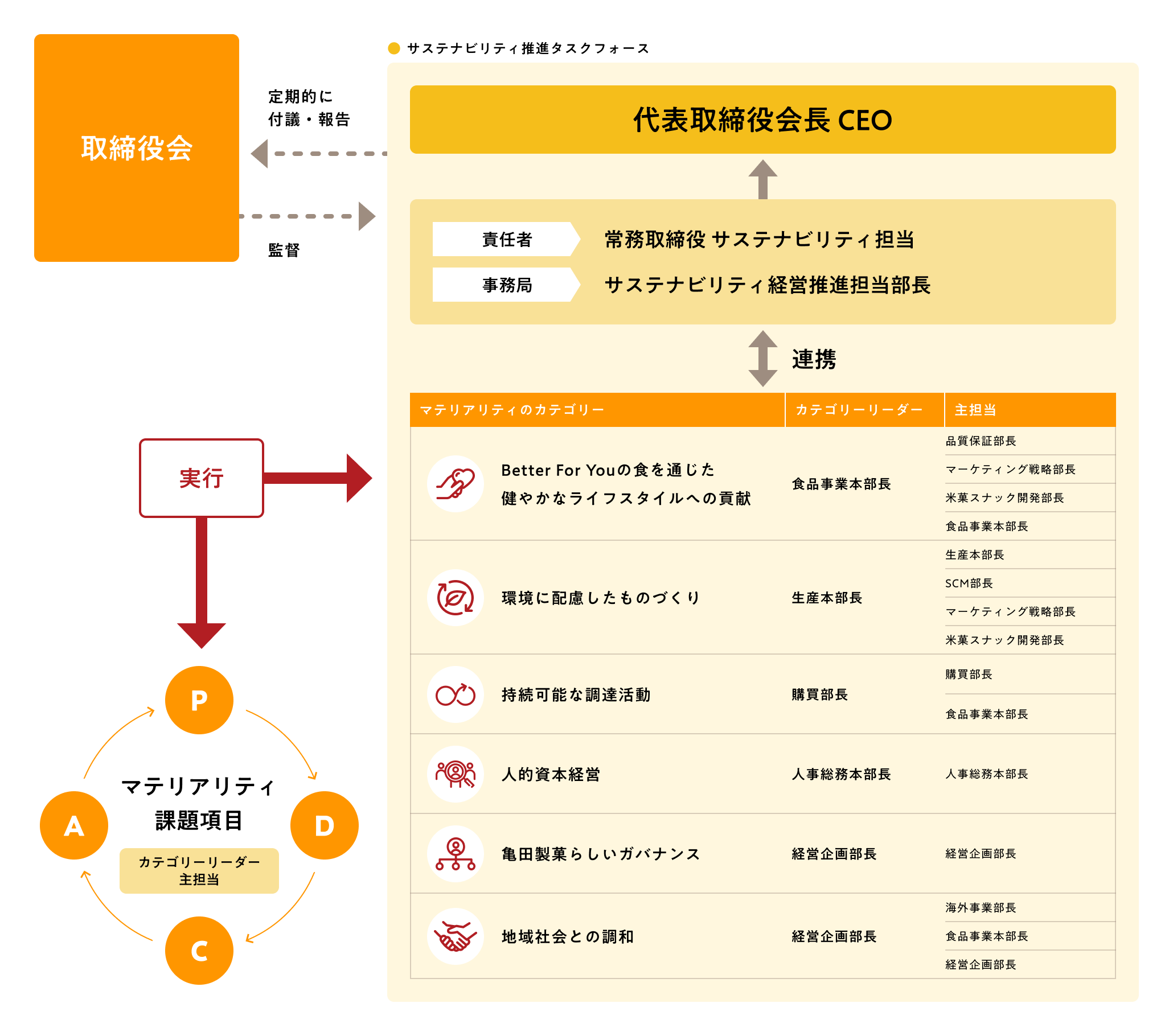 サステナビリティに対する取り組みは多岐にわたり、それらすべてを取締役会において直接議論および検討、監督を行うことは必ずしも効率的ではないことから、2021年に策定したサステナビリティ基本方針*のもと、サステナビリティ推進タスクフォースを発足しました。なお、2025年6月に、環境・社会・ガバナンス(ESG)の視点を経営に本格的に取り入れることで、グローバル企業としての信頼性をさらに高め、ステークホルダーとの関係強化を図り、持続可能な成長と企業価値向上を目的に、サステナビリティ推進タスクフォースのトップに代表取締役会長CEO、責任者に常務取締役サステナビリティ推進担当、事務局にサステナビリティ経営推進担当部長とした体制に変更し、サステナビリティ経営推進体制を再整備しております。